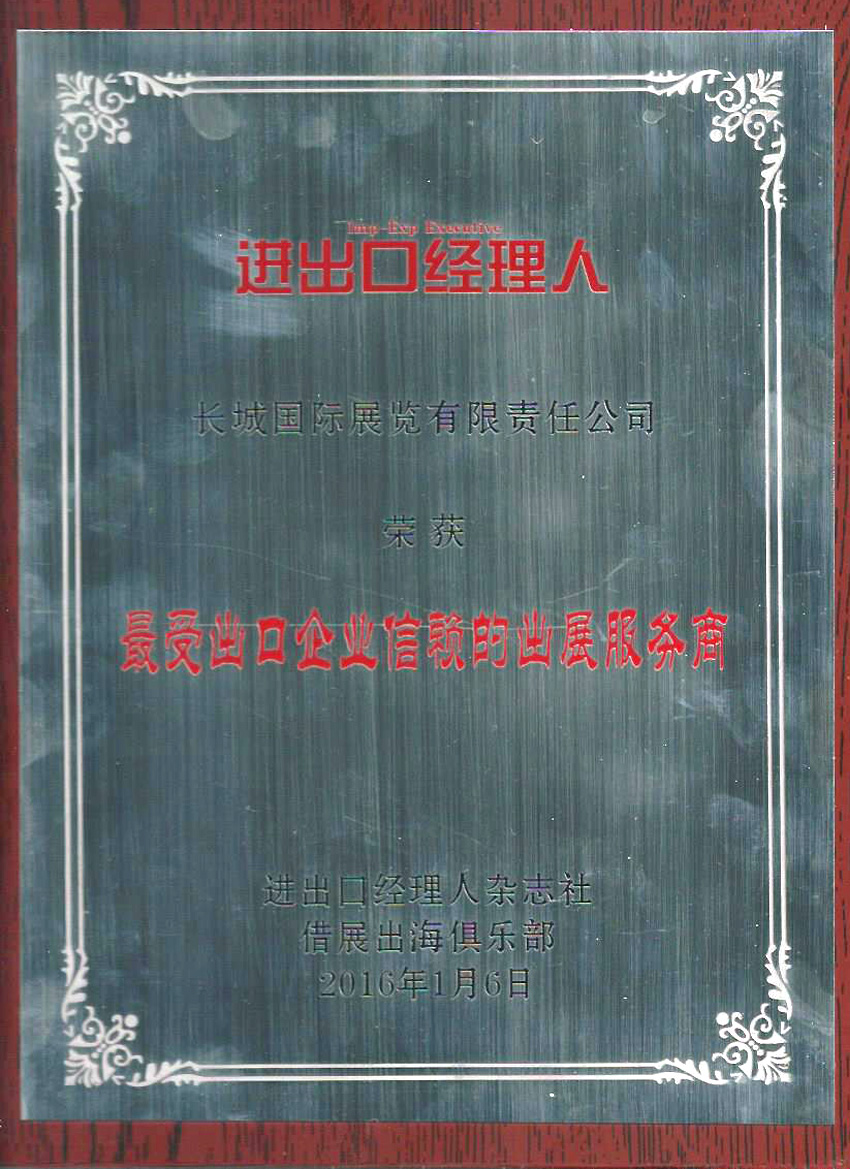 進出口經(jīng)理人雜志社,評價長城國際展覽有限責任公司為最受企業(yè)信賴的出展服務(wù)商。